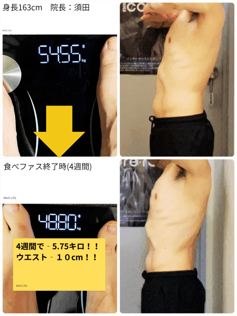 院長の須田 (結果54.5→48.8キロ。ウエスト-10cm)・スタッフの永井 (結果58.25→50.85キロ。ウエスト-14cm)も実践済み。